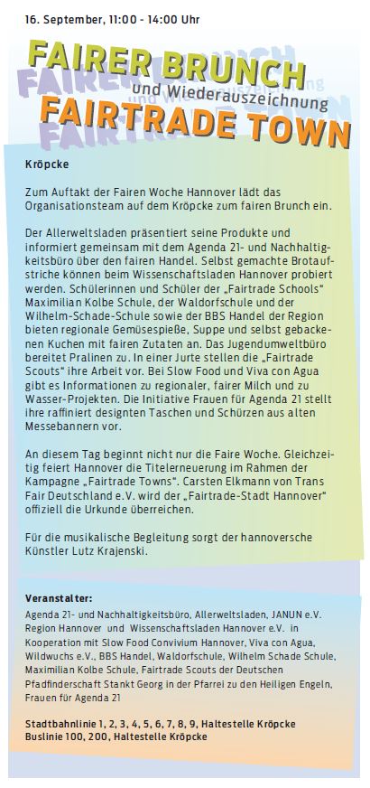 Die Landeshaupstadt Hannover (das Agenda21 und Nachhaltigkeitsbüro im Fachbereich Umwelt und Stadtgrün) hat erneut ein buntes Programm zusammengestellt. Sie können es als PDF hier ansehen, oder es sich im Neuen Rathaus abholen.