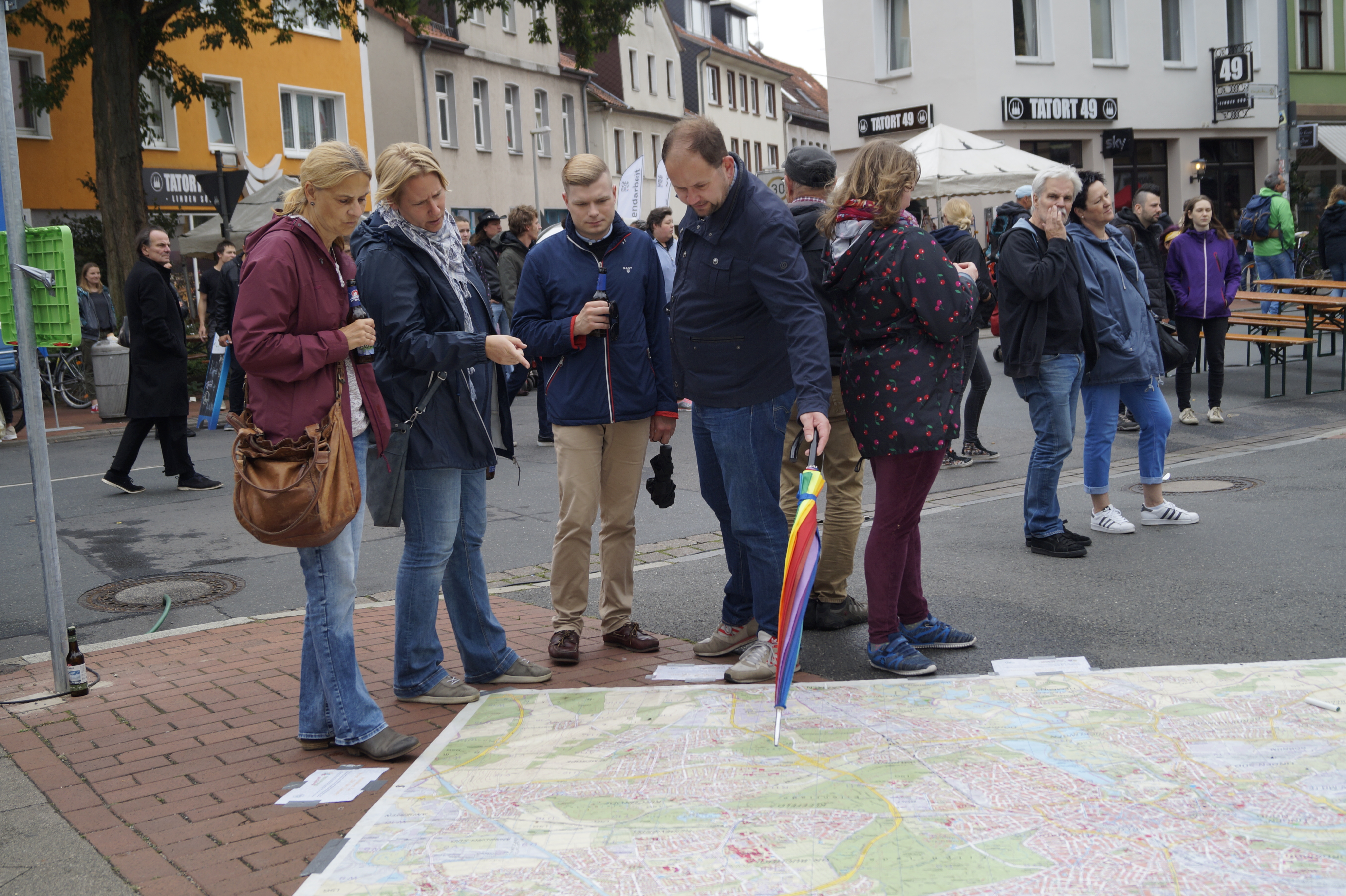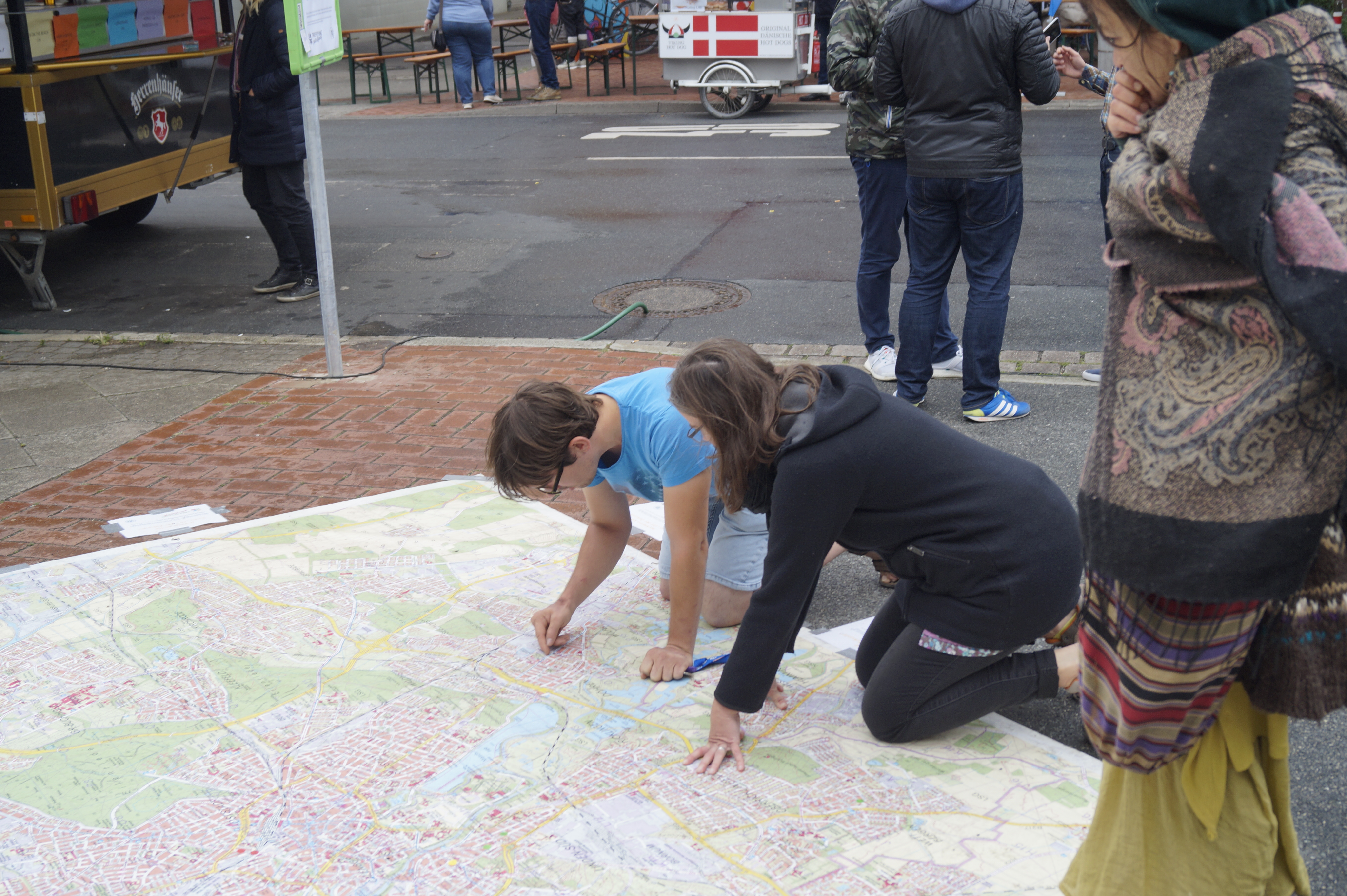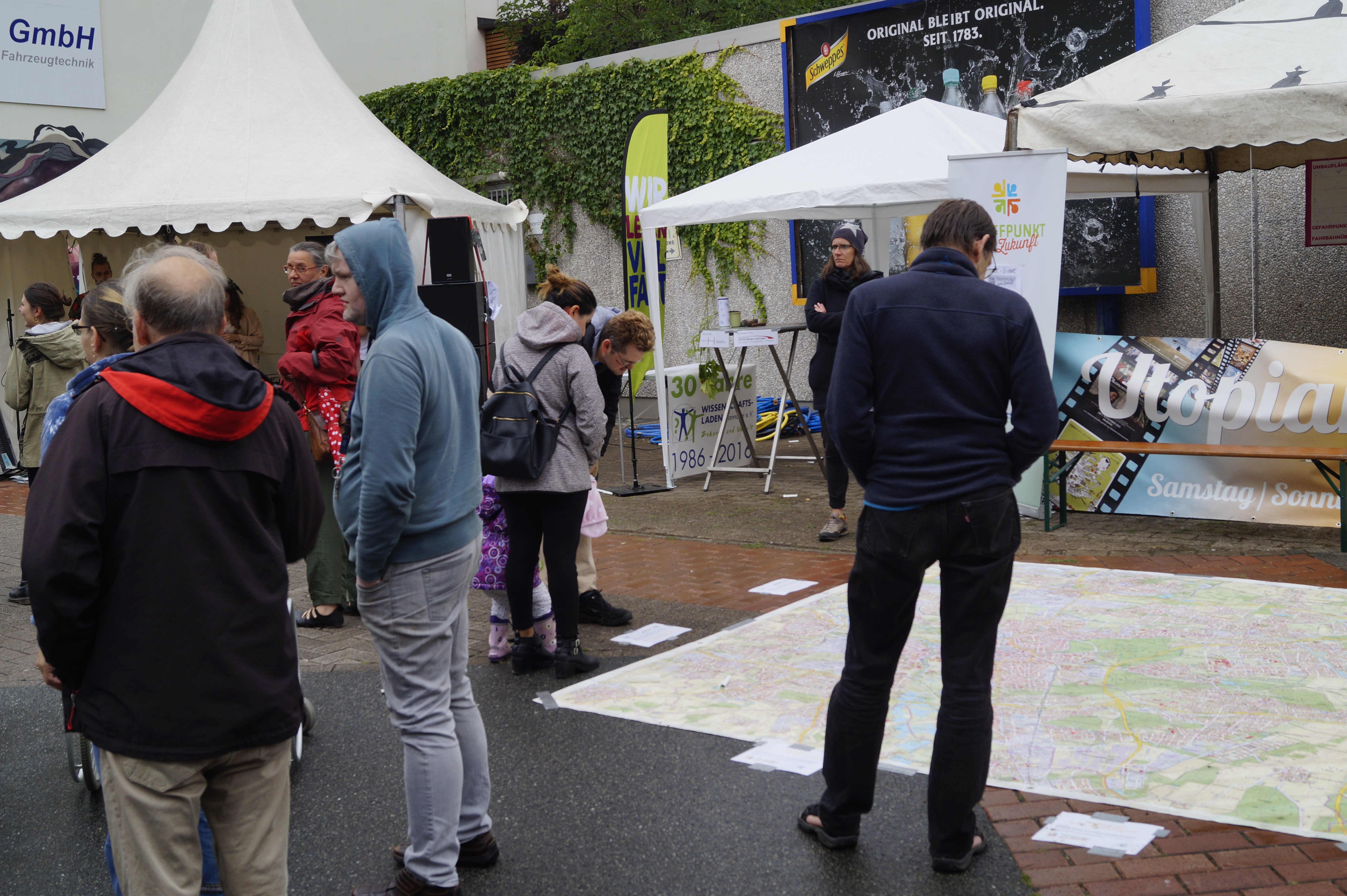 So konnten sie unter anderem ihren „Ort der Zukunft“ auf einer 3x3m Stadtkarte kennzeichnen, per Fahrrad mit dem Ökotrainer ihr Handy aufladen oder sich an vielen kleineren Ständen über Initiativen in Hannover informieren.