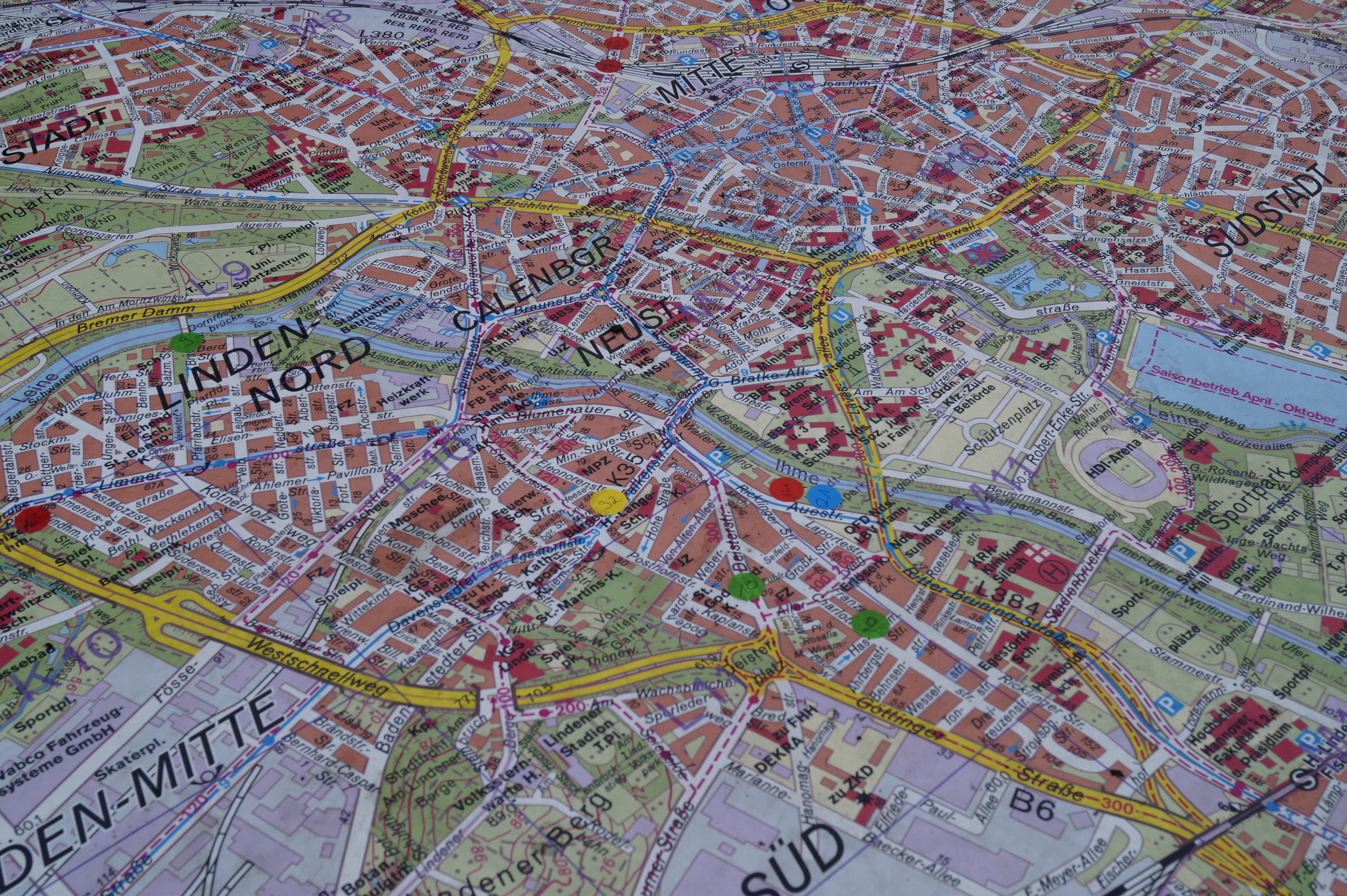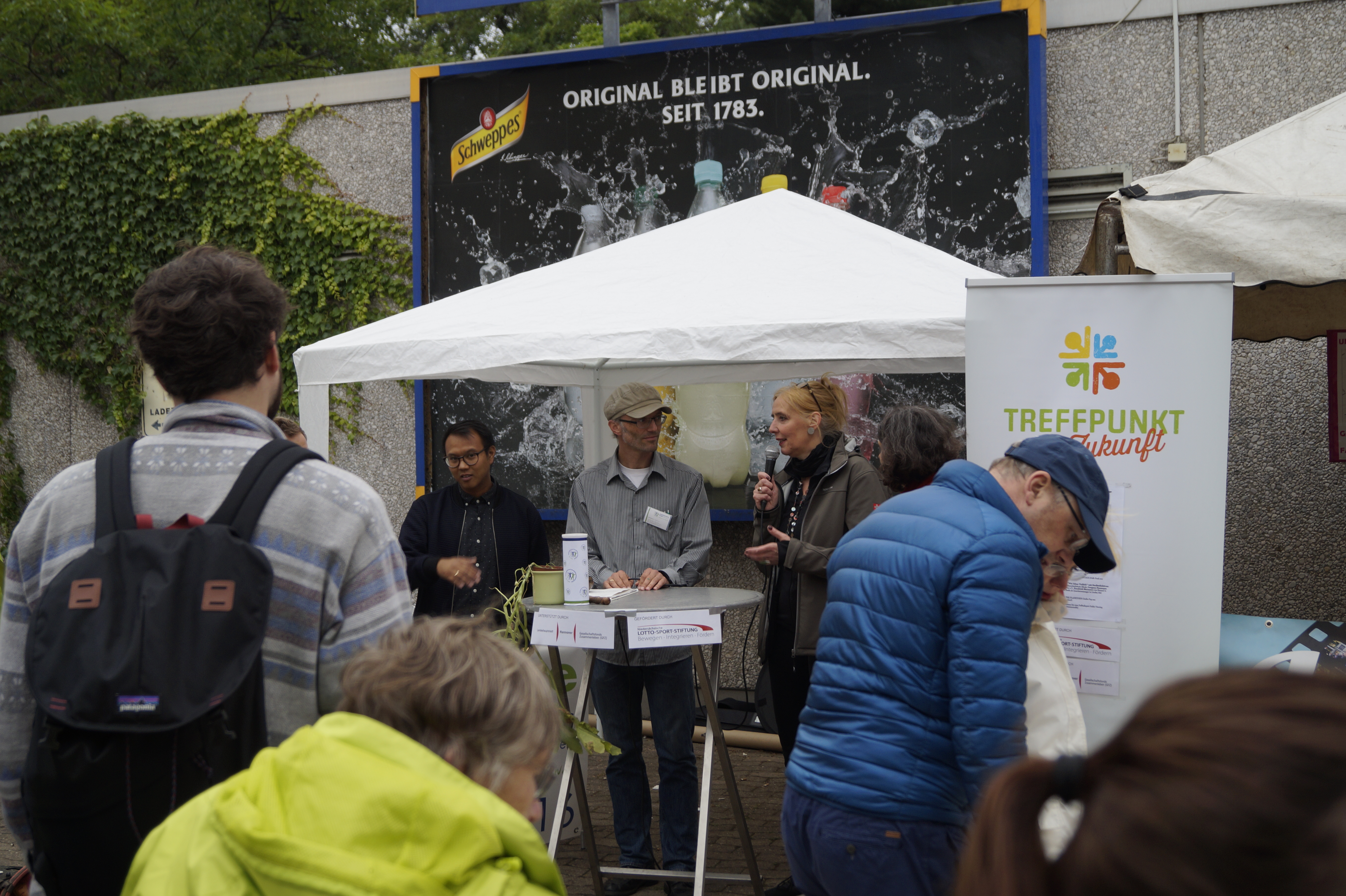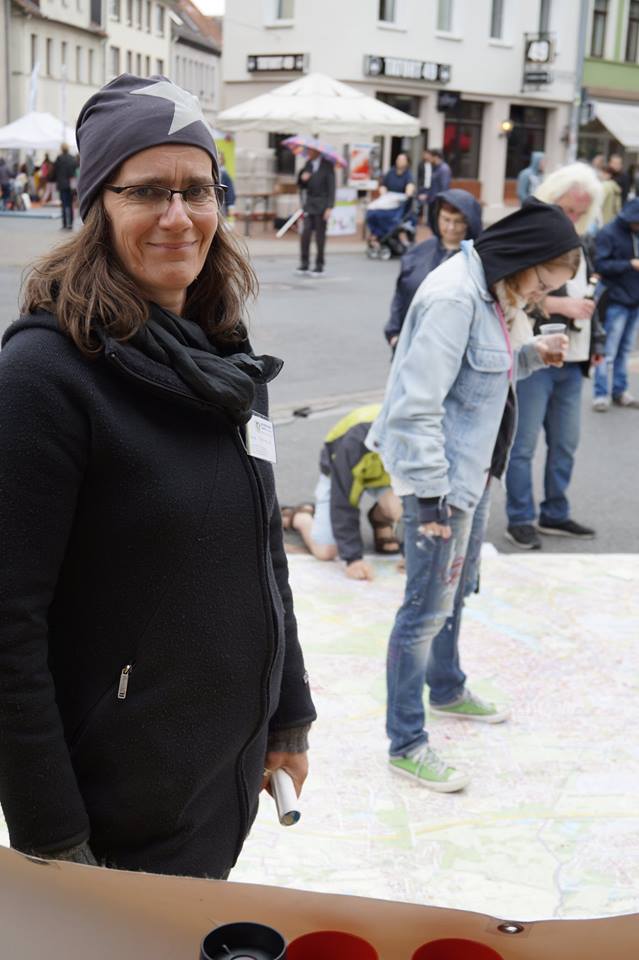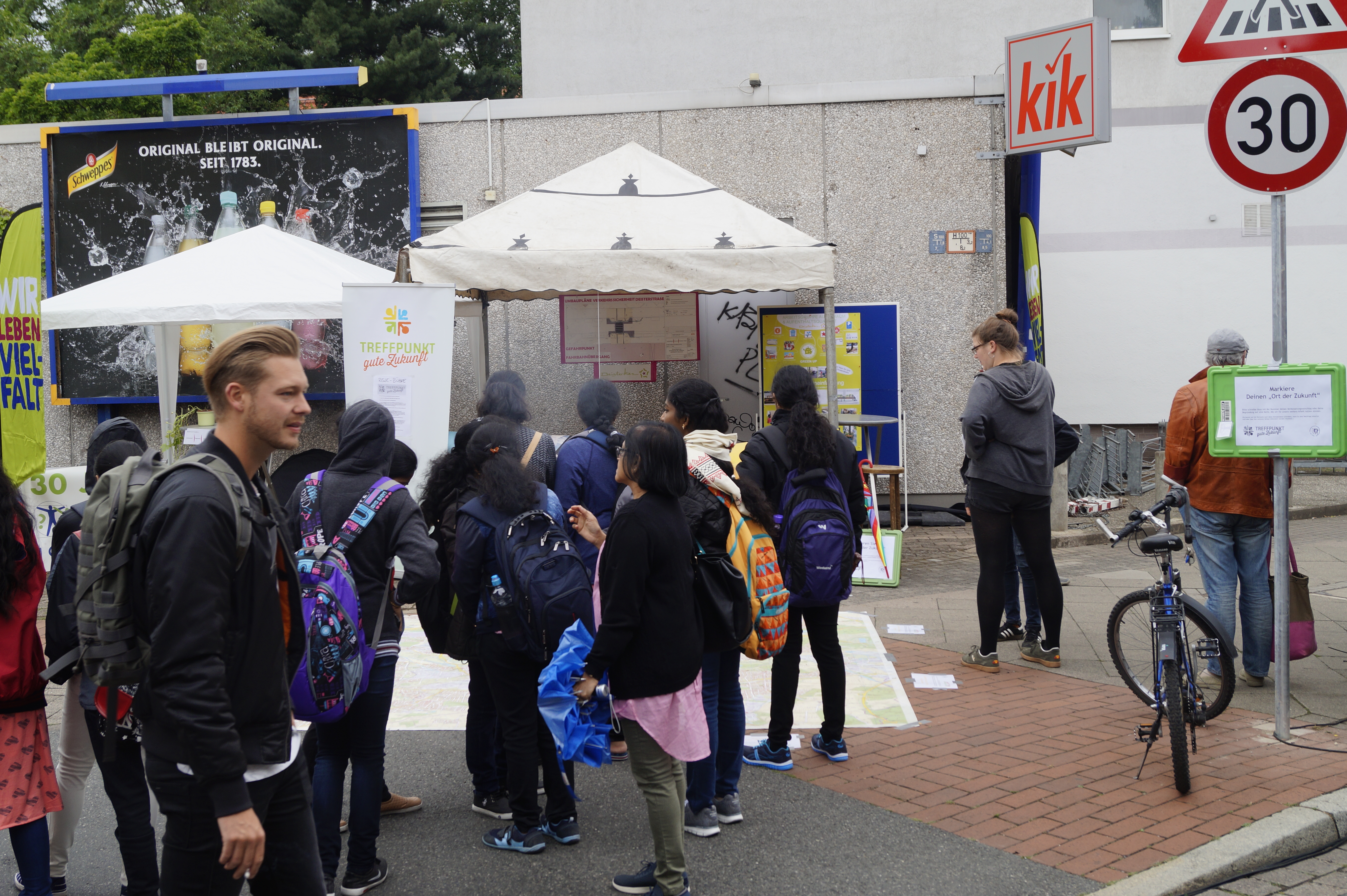 So konnten sie unter anderem ihren „Ort der Zukunft“ auf einer 3x3m Stadtkarte kennzeichnen, per Fahrrad mit dem Ökotrainer ihr Handy aufladen oder sich an vielen kleineren Ständen über Initiativen in Hannover informieren.