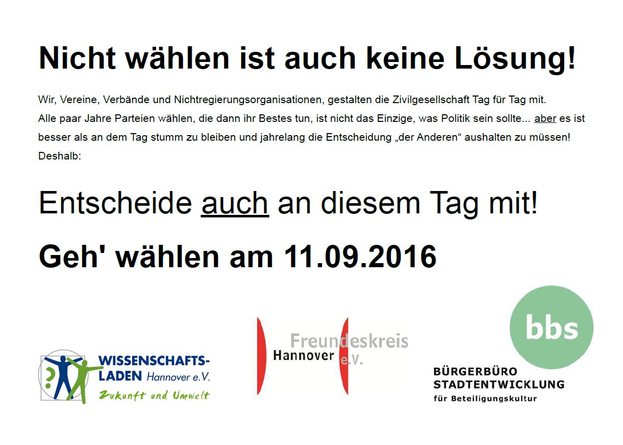 mehr...In Zusammenarbeit mit zwei anderen Organisationen laden wir sehr herzlich ein, sich an der Wahl in Hannover und den Kommunen zu beteiligen: Denn...
